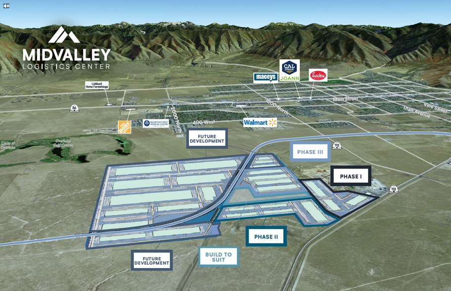 — 26 bâtiments industriels planifiés développement — ±600 acres au total — totalisant plus de 9,5 millions de pieds carrés — Service ferroviaire potentiel — Stationnement sur place pour remorques — Situé immédiatement à la sortie de l'autoroute 112 — Accès sans escale à l'I-15 via l'I-80 — Lumière commerciale zonée (LI)