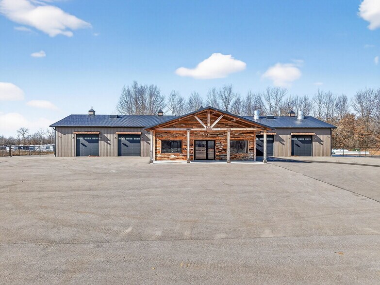 Exceptional commercial opportunity featuring a 9,000+ square foot building situated on approximately 8 acres with major highway frontage for maximum visibility and accessibility. This impressive property is less than two years old and was thoughtfully designed to accommodate a wide range of commercial and industrial uses. The building offers multiple private offices, a functional kitchen area, and expansive shop space with high ceilings and multiple 14'x14' garage doors and one 20'x20' garage door, providing excellent clearance for large vehicles, equipment, and operations. A state-of-the-art premium dual-skin automotive paint booth highlights the property, making it ideal for automotive, fabrication, or specialty trade businesses. A compressed air system runs throughout the building, enhancing efficiency and workflow. The back portion of the main structure includes container storage and a partially fenced area for secure outdoor storage or equipment staging. The hard surface parking area allows for ample employee and customer parking, as well as easy maneuverability for trucks and trailers. With 8 acres of ground, highway exposure, modern construction, and high-end improvements already in place, this property offers an outstanding opportunity for an owner-user or investor seeking a turnkey commercial facility in a prime location.