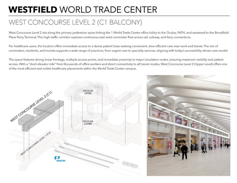 Located at the heart of Lower Manhattan, Westfield World Trade Center anchors the World Trade Center campus as a premier transit and retail hub, connecting the PATH Train, multiple subway lines, and surrounding office towers. It serves as both a commuter gateway and global destination with a constant, diverse flow of visitors. Westfield World Trade Center draws approximately 200,000 people daily, comprised of office workers, tourists visiting the World Trade Center and One World Observatory, and local residents. This built-in population supports steady, all-day foot traffic. Located in West Concourse Level 2, Suite 3125 offers 8,624 square feet of usable space with over 93 feet of prime frontage along the primary pedestrian spine linking the 1 World Trade Center office lobby to the Oculus, PATH, and westward to the Brookfield Place Ferry Terminal. This high-traffic corridor captures continuous east–west commuter flow across rail, subway, and ferry connections. For healthcare users, the location offers immediate access to a dense patient base seeking convenient, time-efficient care near work and transit. The mix of commuters, residents, and tourists supports a wide range of practices, from urgent care to specialty services, aligning with today’s accessibility-driven care model.