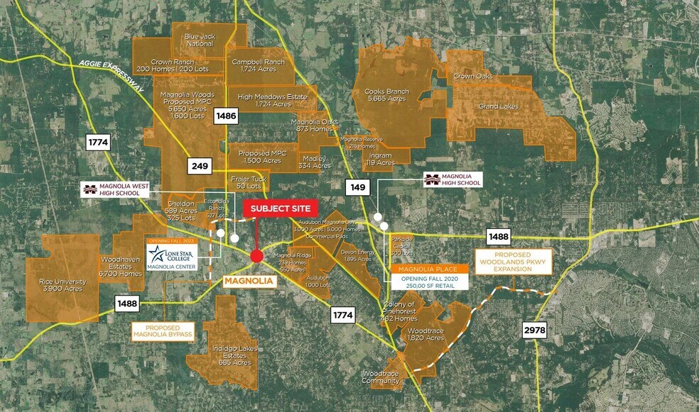 - Situé à l'intersection principale de la FM 1774 et de la FM 1488 au cœur de Magnolia, au Texas, avec des dénombrements de 33 398 voitures par jour.