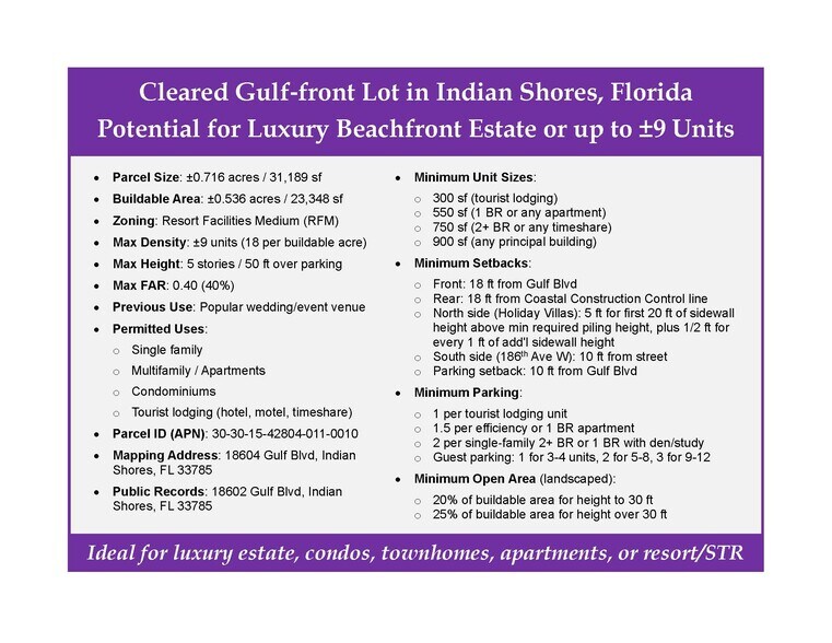 Rare Gulf-front site in Indian Shores, FL with ±0.72 acres, zoned Resort Facilities Medium (RFM). Now fully cleared following recent demolition. ±0.54 acres of buildable area for luxury beachfront estate or up to ±9 condos, townhomes, apts, or STR.