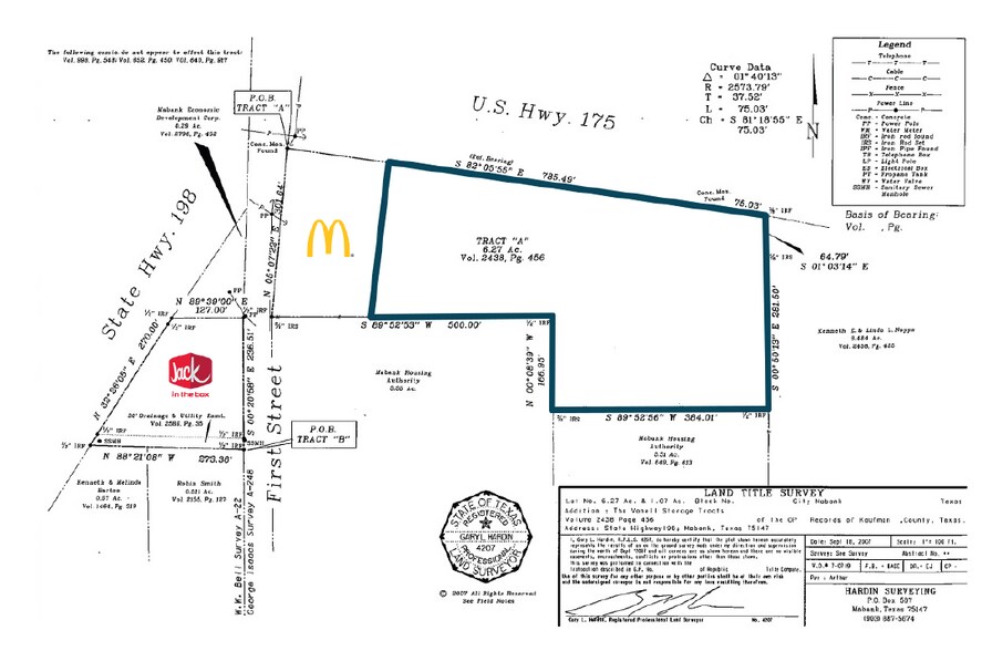 Cette propriété commerciale de ±5 acres, qui peut être subdivisée, est située dans une Zone d'Opportunité à une intersection avec feux de signalisation de deux artères principales à Mabank. Le site offre une excellente visibilité et permet l'installation d'une enseigne sur poteau de 100 pieds. Il se trouve directement en face d'un nouveau Comfort Suites, Starbucks et QuikTrip, et à proximité des écoles de Mabank, qui accueillent environ 2 643 élèves. La propriété n'a aucune restriction d'utilisation, ce qui la rend adaptée à une large gamme d'usages commerciaux, y compris la vente de nourriture comme les burgers.