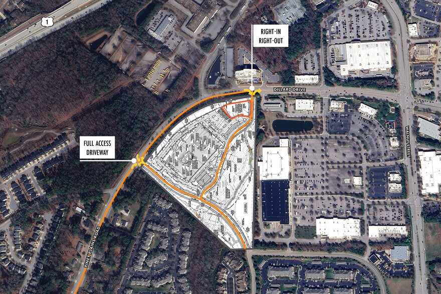 Le site sera livré « prêt à l'emploi » avec tous les travaux sur le site et l'infrastructure hors site terminés, les services publics soudés et les eaux pluviales en place (mi-avril 2025). Dillard Drive Commercial est situé dans le Dellinger Planned Development District (PDD) et a été rezoné en 2021, ce qui permet d'utiliser jusqu'à 50 000 pi2 (minimum 20 000 pi2) de bureaux. Le développement multifamilial adjacent utilisera 5 301 pi2 de l'allocation totale, ce qui laissera un minimum de 14 699 pi2 sur l'aire de bureau. En raison des exigences en matière de stationnement, il y a un potentiel de développement maximal de 15 300 pieds 2. Les utilisations finales sur la propriété sont limitées au bureau et au cabinet médical avec un maximum de 10 000 pieds SF à des fins médicales. Le stationnement de la parcelle à bureaux partagera 20 places avec le site multifamilial adjacent.