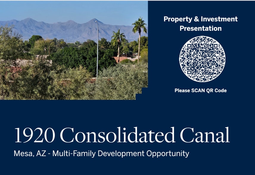 1920 North Consolidated Canal consists of approximately 3.76 acres of fully entitled residential land in Mesa, Arizona, comprising four contiguous parcels totaling approximately 164,256 square feet with frontage along McKellips Road. The site is zoned RM-2 PAD, allowing multifamily development at up to 15 dwelling units per net acre with a maximum lot coverage of 70%. Located at the southwest corner of Stapley Drive and McKellips Road in Mesa’s East Valley corridor, the property offers convenient access to Loop 202 and State Route 87 and benefits from approximately 32,000 vehicles per day along McKellips Road. Nearby amenities include Park of the Canals, Royal Palms Golf Course, Sloan Park, Mesa Arts Center, and extensive trail networks. The elevated and generally level site is located along the Consolidated and Utah Canals, providing natural open-space buffering and direct adjacency to established pedestrian and bicycle trail systems. Utilities, including water, gas, and electricity, are available, with an 8" sewer stub and a 6" ACP water main stub to the site. Preliminary design plans are available and may be leveraged to accelerate development timelines.