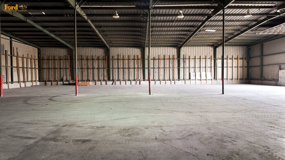 Former mechanics and equipment service building with drive-through access. Includes large bay doors, small storage/shop area, and pallet-style racking for parts and tool storage