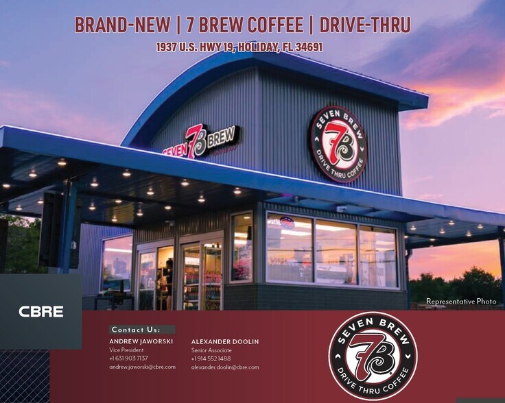 CBRE is pleased to present the exclusive net-lease offering for a newly constructed 7 Brew Drive-thru Coffee containing approx. 540±rentable SF of building space on a .52±AC parcel, located at 1937 US HWY 19 in Holiday, Florida. The property is strategically situated adjacent a Wawa gas station and at a signalized intersection benefiting from direct frontage to both Bonita Road and US HWY 19, the main throughfare servicing the community, providing excellent visibility to over 82,000±VPD.