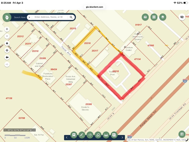 Nice S.IH 35 frontage on one of San Marcos busiest corners. The property is currently being used for an auto dealership but has lots of potential with its easy access in and out, ample parking, along with its high traffic visibility. The build is 1,000 sq ft with 500 sq ft of office space and 500 sq ft of air conditioned shop space that can be easily converted . The total sq ft being offered is 20,790. The area highlighted in red is being offered for lease. Owner would be interested in selling all four parcels that are highlighted in yellow.