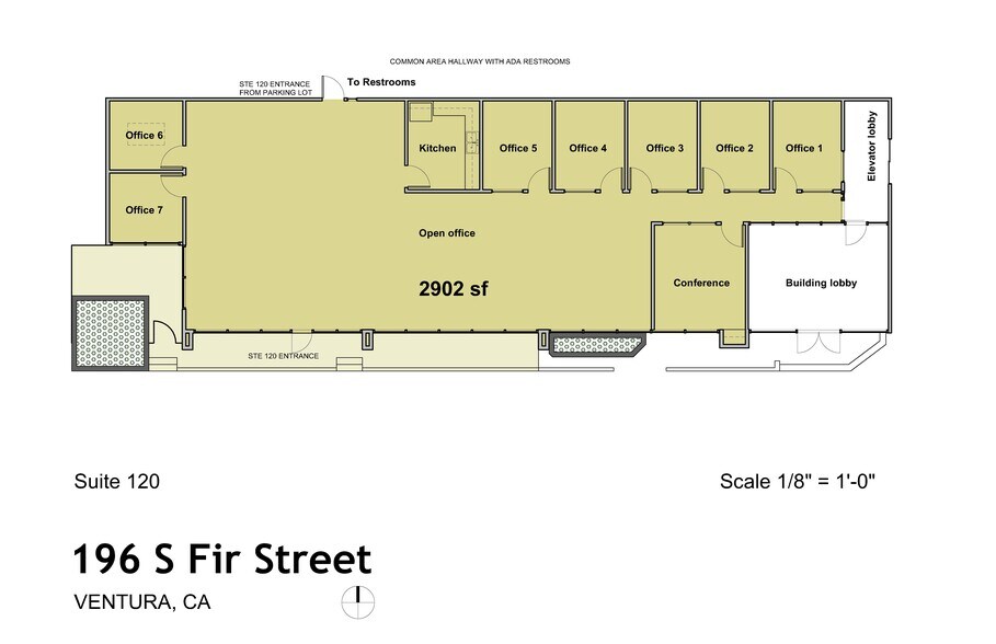 $2.25 PSF Gross Modified Lease on a high quality Class-A office within Downtown of Ventura. Includes onsite parking, common bathrooms maintained by Lessor, close proximity to Post Office, Downtown Main Street, Public Park and More. Large breakroom/kitchenette. Lessee’s choice of partition areas to capture more space. Approx. 2,902 SF - see foot print. Lessor will install a partition wall at the location noted on the footprint - no entry into Ste 120 from the lobby. Located at the corner of S. Fir and E Thompson Blvd, across from Plaza Park. Showings available now and occupancy July 1st, 2026, or possibly sooner. Call 805-985-1000
