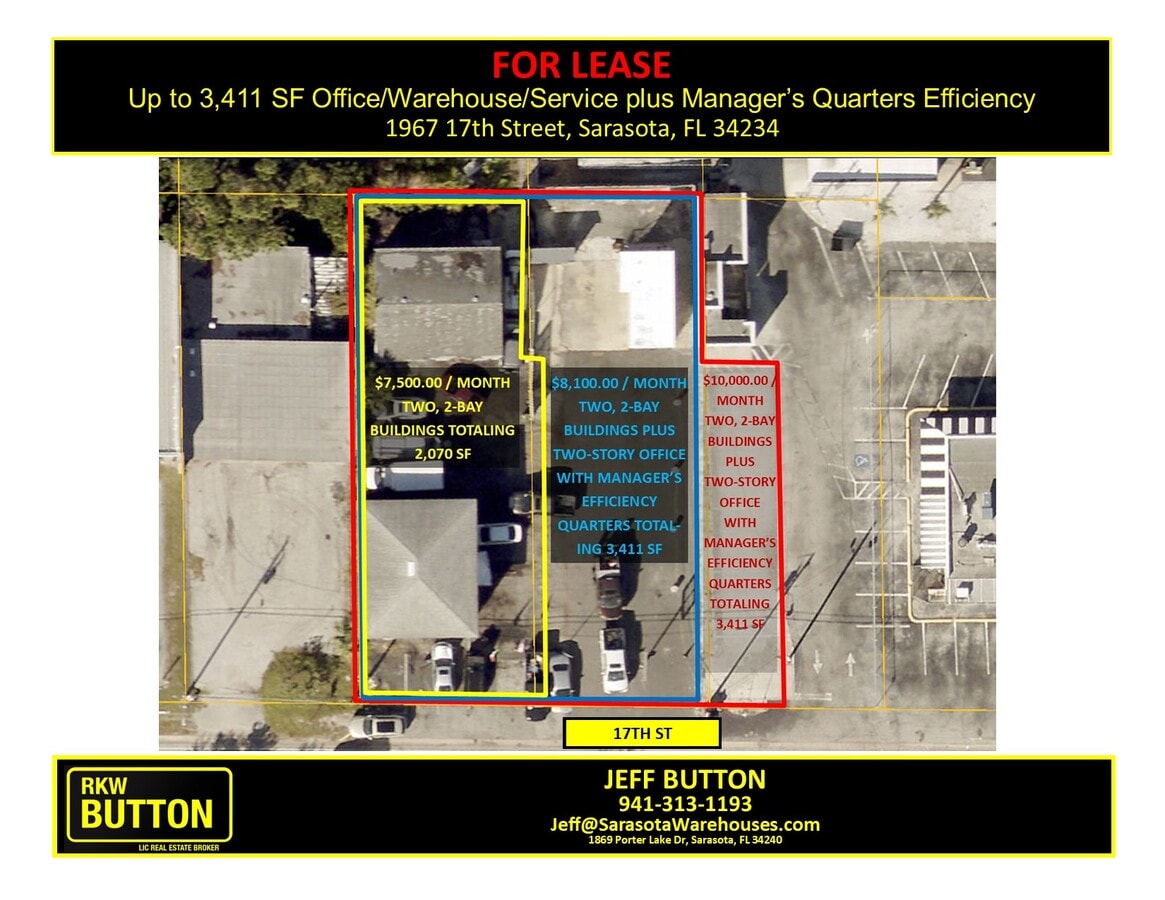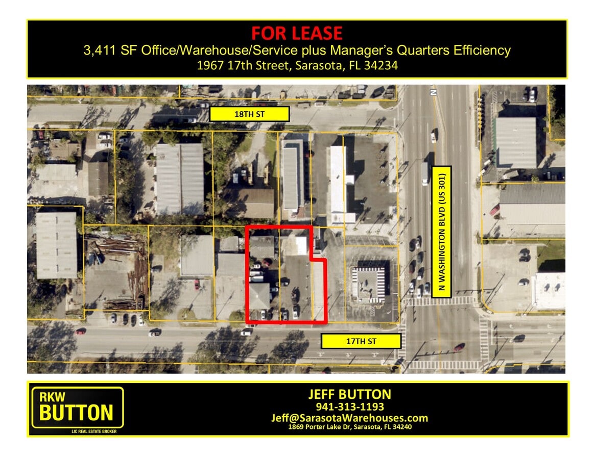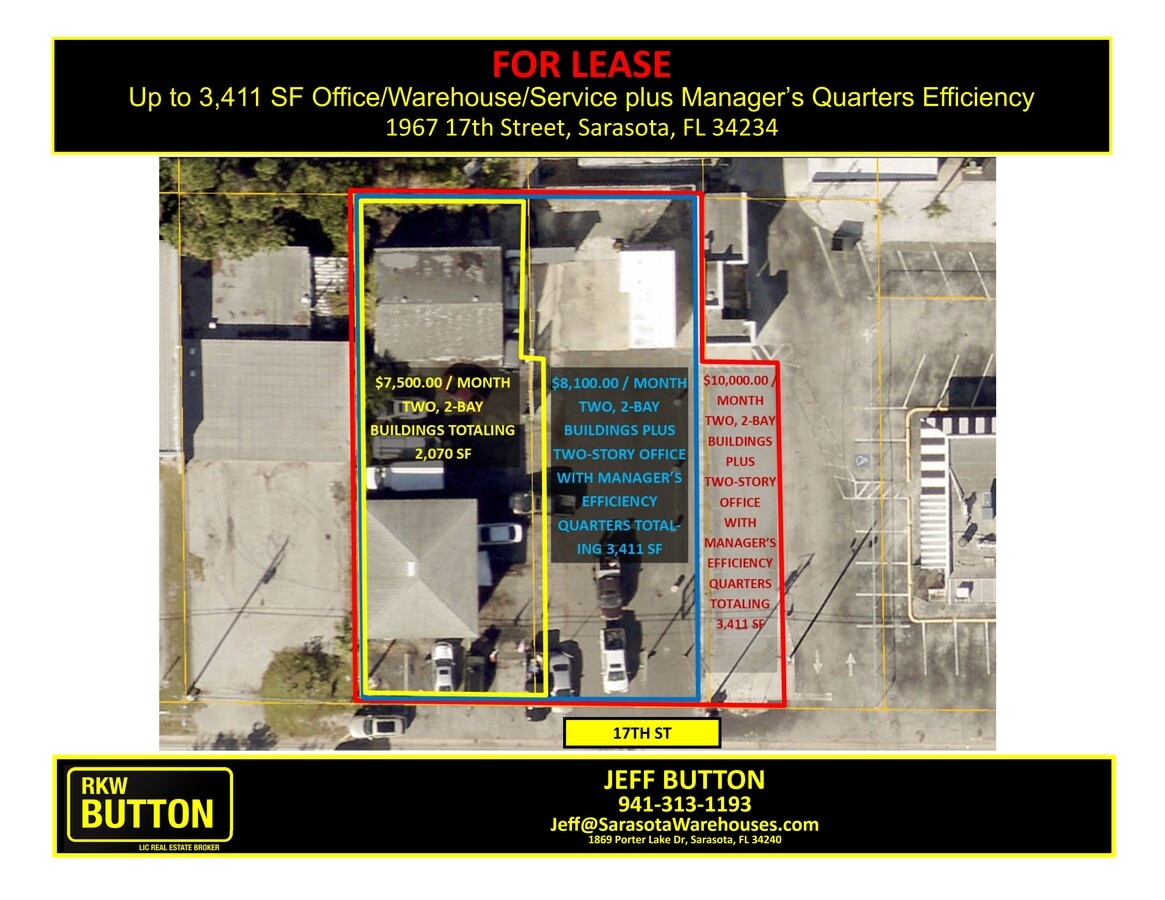 Flexible lease options available 1) Lease 1967 17th St with two, 2-bay buildings totaling 2,070 SF for $7,500/month(yellow outlined area on attached exhibit). 2) Lease 1967 17th St with two, 2-bay buildings totaling 2,070 SF and additional parking area for $8,100/month (blue outlined area on attached exhibit). 3) Lease 1967 and 1973 17th St with two, 2-bay buildings, a two-story office, with 2nd floor manager's quarters, totaling 3,411 SF and additional parking area for $10,000/month (red outlined area on attached exhibit). up to 3,411 SF Office, Warehouse, Service, Storage, Display oriented property with parking, behind the former Hob Nob at 17th St, benefitting from N Washington Blvd (US 301) exposure. 3,411 SF in 3 Fully-Renovated buildings including 2,070 SF with four roll-up doors and small office with restroom. In addition, a newly renovated 290 SF 1st floor office and 2nd floor night manager’s efficiency quarters located on-site. Perfect opportunity for service, trades and businesses requiring outdoor display (such as granite companies) to benefit from prime location and major road exposure.