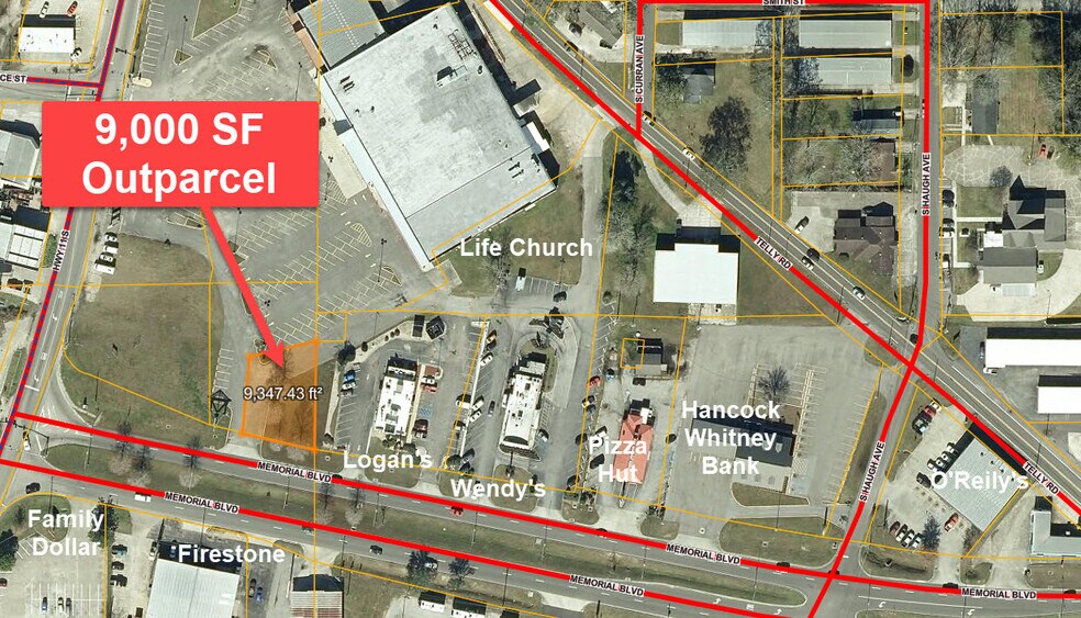 9,000 SF commercial land for lease at $5/SF. Zoned C-3. See attachments for zoning map and permitted uses. 9,000 SF outparcel fronting Memorial Blvd in Picayune, 90 feet fronting Memorial, adjacent to Logan's, Wendy's, Pizza Hut, Hancock Whitney Bank.