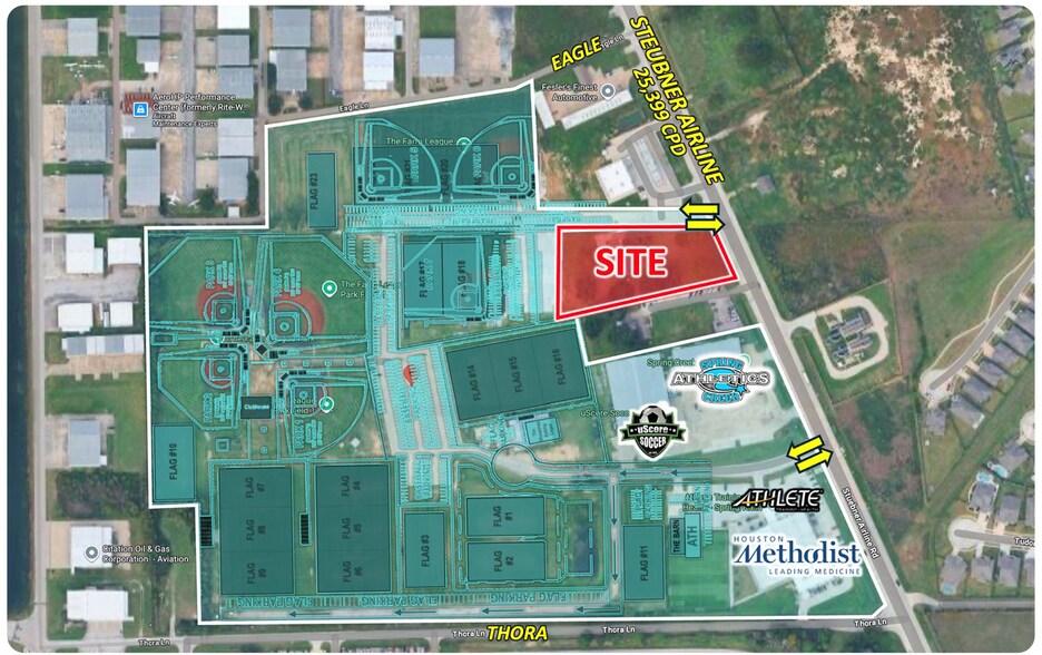 • Prominently positioned at entrance to The Farm League Park, one of the most visited multi-sports complexes in Texas, and a tremendous regional draw. • Ideally suited for restaurant use, retail shopping center, and family-oriented retail uses • Existing Tenant on Property: DO NOT DISTURB • Price: Call for Information THE FARM LEAGUE PARK BOASTS: • Over 1.3M visitors annually • 50 acres of Football fields (3 full-sized), Baseball fields (7) & Flag Football/Soccer/Lacrosse fields (24), and a variety of indoor facilities for tumbling, cheer, dance, volleyball, basketball, and indoor training. • 190 Live Stream cameras simultaneously capture the action for family & friends • 12,000 families currently utilize the park’s MOJO APP to coordinate with teammates • The Park is home to 350 baseball teams, 400 flag football teams, 120 softball teams, 250 basketball teams, and over 100 volleyball teams for steady, year-around play