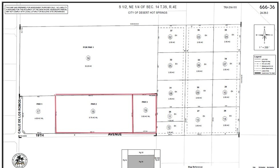 There are 2 adjacent lots offered for sale, APN 666-360-018 which is 9.76 acres, and 666-360-019. which is 3.00 acres. The lots are mostly flat, comprised of lose sand. 19thAve was recently paved with cub and gutter to the east end of the Subject.