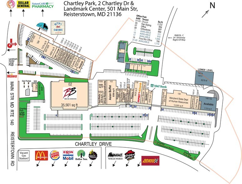 Grand centre commercial bien entretenu et ancré au gymnase avec 651 places de stationnement. Le parc Chartley jouit d'une excellente visibilité le long de la rue Main, sur la principale traînée commerciale de Reisterstown. Liste populaire de locataires, y compris Brick Bodies Gym, Peter's Crab, Family Dollar et l'État de MD.
