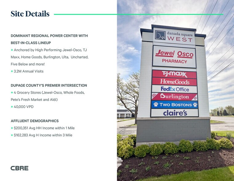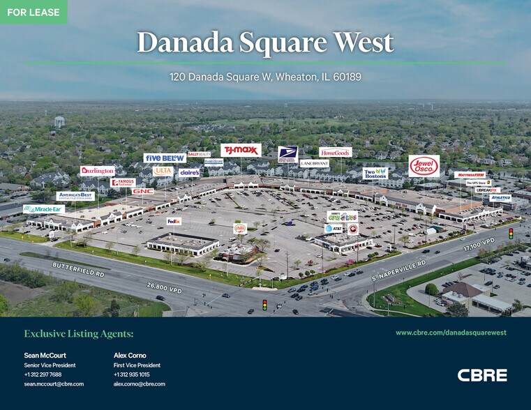 Danada Square West is DuPage County’s premier retail destination, strategically positioned at the high-traffic intersection of Butterfield Road and South Naperville Road, boasting over 40,000 vehicles per day. This dominant regional power center offers unmatched visibility and accessibility, drawing more than 3.2 million annual visits. Anchored by top-performing national retailers including Jewel-Osco, TJ Maxx, HomeGoods, Burlington, Ulta Beauty, and Five Below, the center delivers a best-in-class shopping experience that attracts a loyal customer base. The surrounding area features affluent demographics, with an average household income exceeding $200,000 within one mile and a population of nearly 230,000 within five miles. Nearby grocery options such as Whole Foods, Pete’s Fresh Market, and Aldi further enhance the retail synergy. Tenants benefit from strong co-tenancy, ample parking, and proximity to Wheaton’s vibrant residential neighborhoods and community amenities, including the Wheaton Park District Recreation Center. Available suites range from boutique spaces ideal for specialty retailers to larger footprints suited for national brands. This is an exceptional opportunity to position your business in a thriving retail corridor with proven traffic and purchasing power.