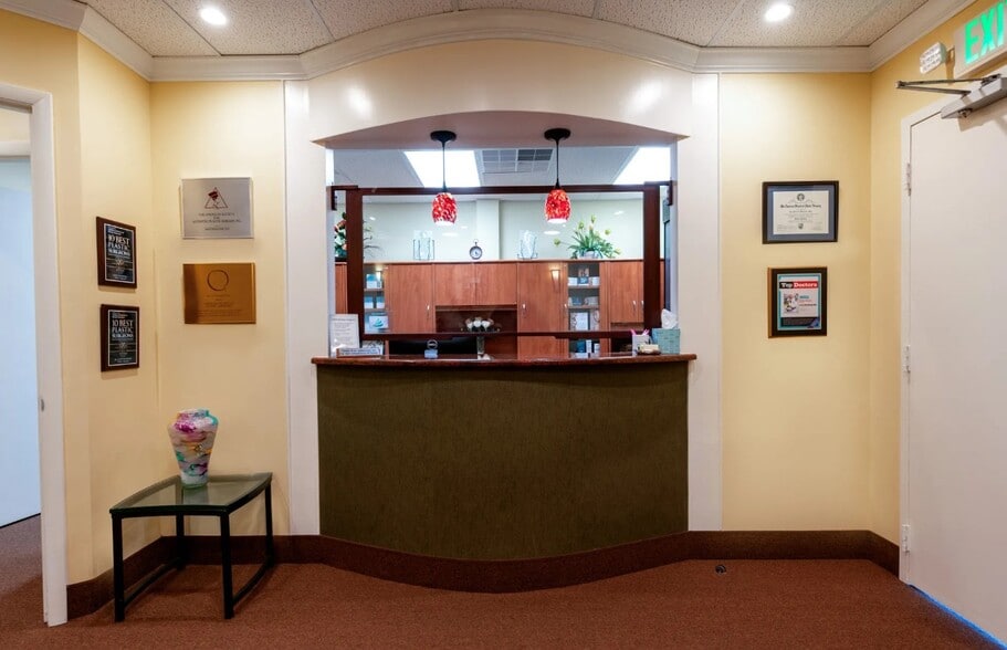 High-quality luxury vinyl plank flooring extends throughout all exam rooms, the lab, restroom, and break room, ensuring a clean, modern, and low-maintenance environment. The unit also includes two private physician offices as well as a large receptionist/business office complete with custom built-in furniture (available with purchase), providing ample administrative and storage space.