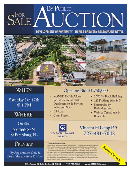 Auction Property. Auction Property. **Auction!! The List Price is the Opening Bid. Sold LIVE ONSITE Sat Jan 17th at 1 PM at the property. The public is welcome to participate Sold Free and Clear of ALL Liens. ZONED DC-2 this property is positioned to be re-invented or re-introduced into the thriving area. New high end, Hi Rise condos, apartments, restaurants, brewery, retail or school are possible. Hundreds of new privately owned residential and rental units surround this spot. DC-2 Zoning permits Intense Residential Development and services to support such. The property is .55 Acres and flat. The existing building sits on the 127 feet of frontage along 16th St N and can be reconfigures easily as it is an open span 3,700 Sq Ft with 16 to 22 foot ceilings. Plenty of grass in the rear of the property would suit many retail or service uses. Opportunity is Knocking!! Answer the Call!!