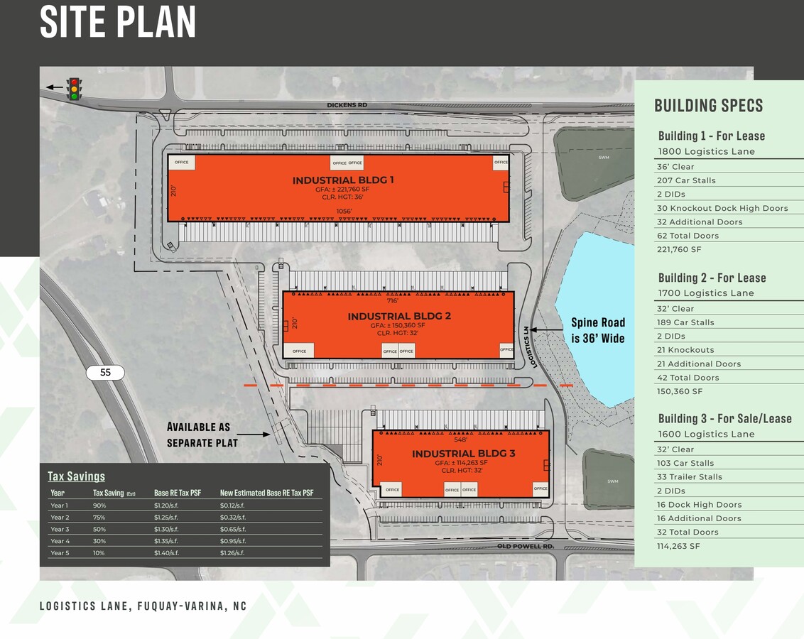 Stotan Crossings 55 is a Class A industrial park in Fuquay-Varina, serving the rapidly expanding Raleigh-Durham market. The three-building development will total nearly 490,000 square feet, offering modern mid-size space designed to meet strong demand in South Wake County. Strategically located on Dickens Road with direct access to NC-55 and close proximity to I-540, Raleigh-Durham International Airport, and Research Triangle Park, the development is ideally positioned to serve a wide range of logistics and distribution users in one of the nation’s fastest-growing markets.