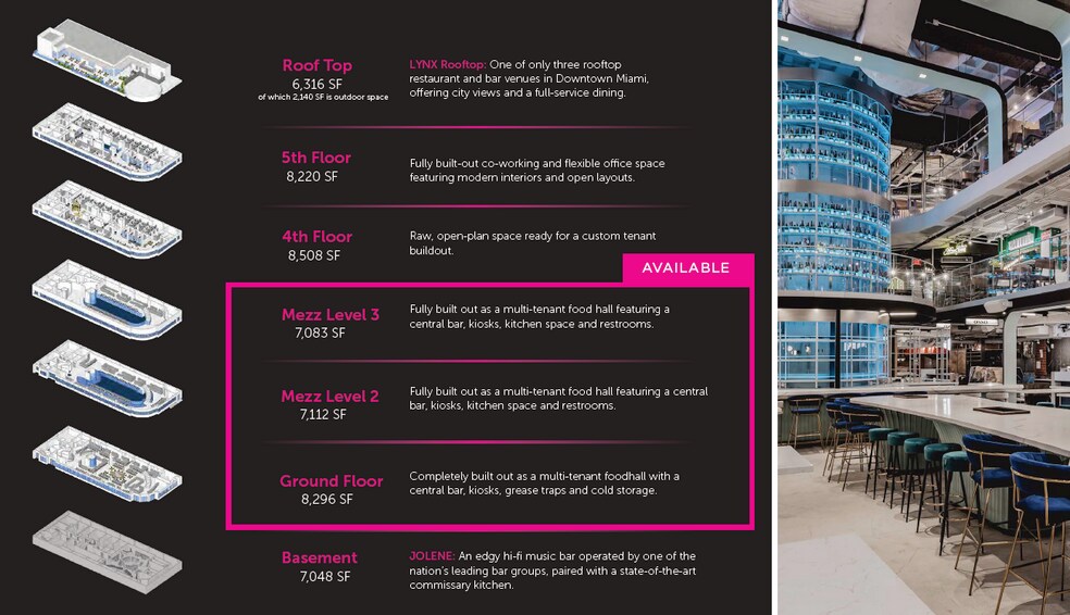 • TURNKEY ROOFTOP RESTAURANT OPPORTUNITY – FULLY BUILT-OUT F&B SPACE IN THE HEART OF DOWNTOWN MIAMI •1 30 TOTAL SEATS – 70 INTERIOR + 60 EXTERIOR WITH BREATHTAKING SKYLINE VIEWS • FULLY EQUIPPED KITCHEN LAYOUT – INCLUDES WALK-IN COOLERS, DISHWASHER ROOM, SERVICE ZONES, AND OUTDOOR BAR • LOCATED IN MIAMI’S FLAGLER DISTRICT – SURROUNDED BY BRIGHTLINE, BAYSIDE, KASEYA CENTER, AND MIAMI WORLDCENTER • HIGH VISIBILITY & FOOT TRAFFIC – BENEFIT FROM THE FLAGLER STREET REDEVELOPMENT AND NEARBY CULTURAL LANDMARKS • TWO ADA-COMPLIANT RESTROOMS – FAMILY AND UNISEX RESTROOMS WITH STYLISH FINISHES • PERFECT FOR ELEVATED CONCEPTS – IDEAL FOR ROOFTOP DINING, LOUNGES, OR EXPERIENTIAL HOSPITALITY BRANDS