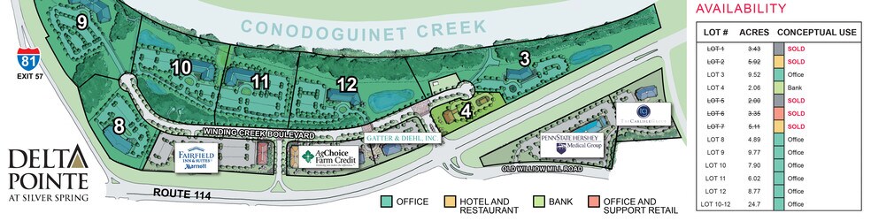 Located at the signalized intersection of Conodoguinet Parkway and Honey Locust Drive, this 2.06-acre parcel offers exceptional visibility and accessibility within the prestigious Delta Pointe at Silver Spring development. With a premier address at 200 Winding Creek Boulevard, the site benefits from strong traffic counts, direct access to I-81 (Exit 57), and proximity to the Carlisle Pike (US-11), the region’s dominant retail corridor. Preliminary concept plans envision a 12,140 SF commercial building, making the parcel ideally suited for retail, medical, or service-oriented users.
