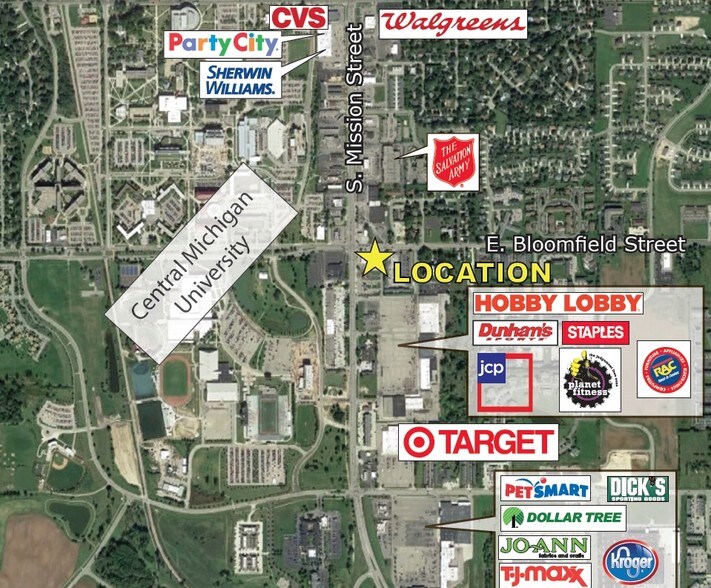 Located at a busy signalized intersection with multiple points of ingress and egress. .69 Acres with excellent parking(4.82/1,000). Across from Central Michigan University.