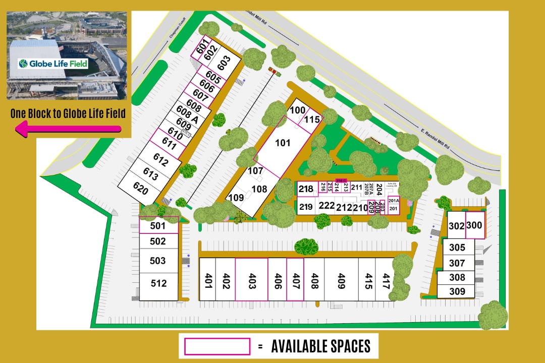 Westgate Plaza Business Park offers premium office, retail, and flex space just one block east of Globe Life Field at the corner of East Randol Mill Road and Magic Mile Street, with high-visibility signage at a busy intersection. This single-story, 10+ acre campus features beautifully landscaped grounds with over 50 mature Live Oak, Red Oak, and Crepe Myrtle trees, creating a park-like setting complete with shaded seating areas for outdoor breaks. Recently remodeled spaces showcase modern finishes such as solid core birch doors with prefinished metal frames, reveal-edge acoustic ceilings, LED motion-activated lighting, and replaceable carpet tiles or optional luxury vinyl flooring. Breakrooms are equipped with quartz countertops, stainless steel under-mount sinks, Delta pull-down faucets, and soft-close cabinetry for a high-end feel. Energy-efficient upgrades include TPO roofing with R-20 insulation, LED-lit parking lots, and exterior lighting, while concierge-style property management ensures exceptional service. With walkable access to Texas Live and Loews Hotel dining, plus easy connectivity to major highways, Westgate Plaza delivers a professional, convenient, and visually appealing environment for businesses seeking office, retail, or flex space in Arlington’s Entertainment District.