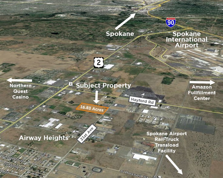 Situé dans la zone Opportunity Heights Airway Heights Excellente capacité pour les grands projets d'aménagement à locataire unique ou les bâtiments Flex industriels légers Airway Heights est l'endroit où se produit une grande partie de la croissance industrielle de la région de Spokane Situé juste à côté de la route 2 des États-Unis, au cœur de Airway Heights Emplacement en coin dur avec façade sur la 21e avenue devant être agrandi à 5 voies, actuellement en construction à l'est du chemin Hayford