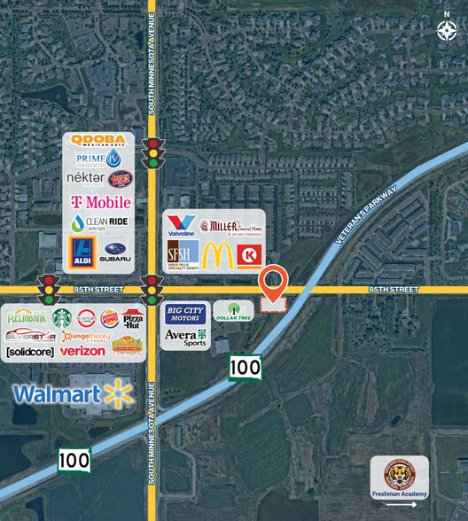 High-profile build-to-suit opportunity located near the signalized intersection of 85th Street and Minnesota Avenue. Size: 6,550 sqft (subdividable) Price: Contact Broker Traffic: Minnesota Avenue: 19,400 vpd 85th Street: 12,200 vpd Available: Built-To-Suit Area Tenants: Walmart, Aldi, Primrose Schools, Starbucks, Circle K, Scooter’s Coffee, McDonald’s, Burger King, Verizon, Subaru, T-Mobile, Nekter Juice Bar, Jersey Mike’s Subs, Valvoline, Little Caesars, Pizza Hut