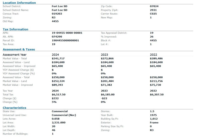 This property is located in a high-visibility area near the Route 4, 95 and 46 exit ramp. It is ideal for professional use or small retail. The building is a two-story commercial property with two bathrooms. The owner holds a New Jersey Real Estate Commission (REC) license.