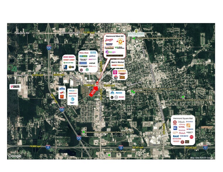Hammond West Shopping Center is a 19,531-sf neighborhood retail center situated on West Thomas Street (17,889 vpd), the primary commercial corridor in Hammond. The property is surrounded by national and regional retailers, restaurants, and service providers, offering exceptional visibility, ample surface parking, and convenient access to both I-55 and I-12. It is an ideal location for retail, medical, or service tenants seeking strong traffic counts and a well-established trade area. The one available suite in this center shares parking with other tenants and has the opportunity for both façade and monument signage.