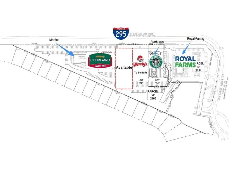 JOIN ROYAL FARMS, STARBUCKS AND MARRIOTT! The New Castle Travel Center is a brand new retail development project featuring inline retail and a freestanding pad available for lease. The property has unparalleled visibility facing I-295 which sees more than 118,000 VPD, and is located at one of the busiest interchanges in Delaware. Access to the project is via a service road connected with New Castle Avenue and the I-295 northbound exit ramp to New Castle Avenue.