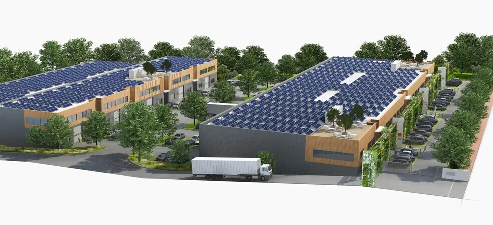 La cellule prend place au sein d’un ensemble neuf pensé pour accueillir des activités industrielles et artisanales, avec un niveau de fonctionnalité adapté aux besoins opérationnels modernes. L’organisation s’articule entre un niveau inférieur destiné aux activités et un niveau supérieur aménageable en bureaux, offrant ainsi une configuration complète au sein d’un même volume. L’accès livraison est facilité par une porte de plain-pied dédiée, permettant la circulation de véhicules utilitaires ou poids lourds selon les besoins. Les aménagements prévus incluent une ventilation double-flux, un éclairage LED performant ainsi que la possibilité d’installer une infrastructure photovoltaïque en toiture. L’ensemble est conçu pour garantir confort et efficacité, grâce à une hauteur généreuse sous poutre, à une structure métallique robuste et à des murs en double bardage. L’entrée se fait par un accès piéton vitré et l’environnement de travail est complété par plusieurs zones prévues pour les deux-roues. Une cour indépendante est réservée au bâtiment afin de faciliter les opérations extérieures et les flux logistiques associés.