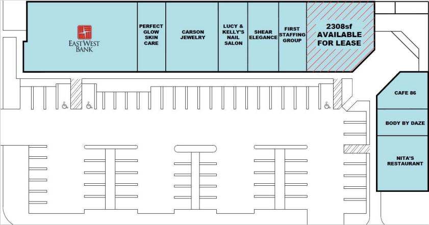 High profile floor to ceiling glass storefront Adjacent outside patio Direct line of site to vehicular main entrance Office, storage area adjacent to main showroom Private bathrooms Rear emergency exit Divisible/Flexible Terms