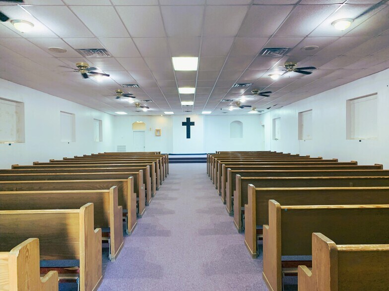 Le sanctuaire principal, d'environ 4 800 pi2, a des salles de préparation attenantes avec toilettes et était autrefois utilisé pour l'espace des appartements. Adjacente au sanctuaire, la salle de rassemblement de 3 900 pieds carrés est bordée de plusieurs salles de classe, de bureaux et de toilettes pour hommes et femmes (3 stalles chacune). Une grande cuisine de qualité commerciale s'ouvre sur une grande salle, idéale pour les rassemblements, les événements ou les repas collectifs. La troisième structure à l'arrière de la propriété est un garage divisé à plusieurs portes, avec une salle d'entreposage au bouchon. La propriété offre également un parking généreux, des arbres matures, une cour et une cour latérale.