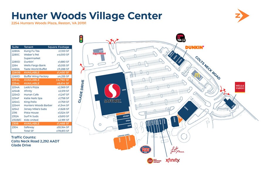 About Hunters Woods Village Center Hunters Woods Village Center in Reston, Virginia is a well-positioned neighborhood retail and service hub anchored by everyday essentials such as Safeway, Rite Aid, Jersey Mike’s, Dunkin’, and a mix of local service tenants and eateries, all organized around a walkable plaza format that serves the surrounding residential community. The center sits on approximately 12.8 acres of non-residential land with direct access from Glade Drive and Colts Neck Road, making it a convenient destination for residents within South Reston. Within a one-mile radius of the property, there are nearly 20,000 residents and over 7,300 households, with median household incomes approaching $163,000 and daytime population exceeding 20,000, while the three-mile trade area supports nearly 120,000 people and household incomes above $205,000. This demographic profile reflects a mix of established households and active adults with strong spending power and a high rate of college education. Reston itself is a mature, mixed-use community founded on principles of integrated living connecting residential, retail, office, and recreational space with as Hunters Woods is one of its original village centers. The broader market around the center benefits from a stable population base, a high average age in the late 30s, and housing values that reflect the strength of the local real estate market, with median home values well above regional averages. The presence of community assets such as the Reston Community Center, nearby senior living developments, and convenient transit options contribute to consistent foot traffic and ongoing neighborhood activity. With strong demographics, solid household incomes, and a location within the greater Washington-Arlington-Alexandria metro area, Hunters Woods Village Center continues to play an important role as a neighborhood-serving retail destination within Reston’s larger economic framework. About Fairfax County Fairfax County, Virginia is one of the most dynamic and economically influential counties in the United States, known for its strong workforce, high educational attainment, and robust business environment. Located just outside Washington, D.C., the county is home to major federal agencies, Fortune 500 companies, and a thriving technology and defense sector. Its excellent transportation network—including Metro access, major highways, and proximity to Dulles International Airport—supports both regional and global connectivity. With top-rated schools, diverse communities, and a high quality of life, Fairfax County continues to be a premier destination for residents, employers, and long-term investment.