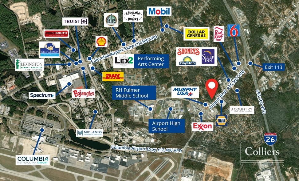 Cette propriété commerciale de premier choix, d’une superficie d’environ ±2,5 acres, offre une visibilité exceptionnelle grâce à ses 250 pieds de façade le long du très fréquenté Boulevard de l’Aéroport, qui enregistre un débit quotidien de 35 500 véhicules. Stratégiquement située à seulement 0,6 mile de l’I-26, cette propriété bénéficie d’un accès pratique à l’Aéroport Métropolitain de Columbia et au campus de l’Aéroport du Midlands Technical College. Avec une topographie plane et un zonage commercial général dans la ville de Springdale, ce site est idéal pour des usages tels qu’un motel, un commerce automobile, un restaurant ou un commerce de détail. Dotée d’un accès aux services municipaux d’eau et d’égouts, cette propriété représente une opportunité rare pour les entreprises souhaitant s’établir dans une zone à fort trafic et bien connectée.