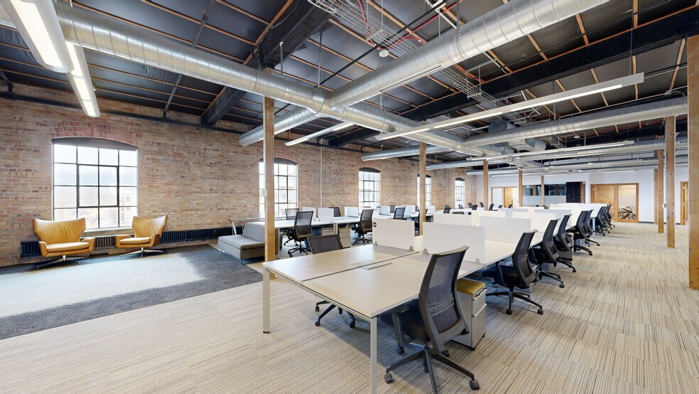 - Ambiance de style industriel avec des murs de briques intemporels, des plafonds apparus, des éléments en bois robuste et la lumière naturelle provenant de fenêtres d'époque.