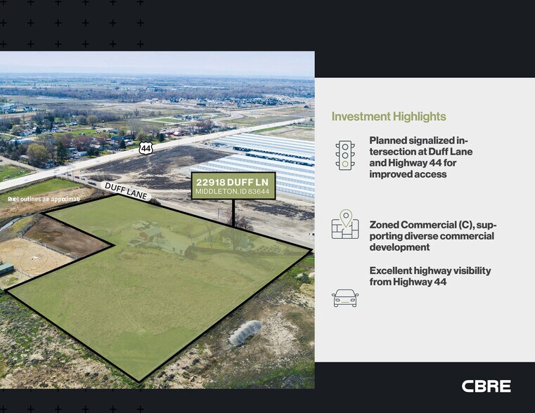???????CBRE is pleased to present the opportunity to acquire ±5.01 acres of developable commercial land located along the intersection of Duff Lane and Highway 44 in Middleton, ID. This development site is surrounded by new residential construction, office and retail and entertainment centers.