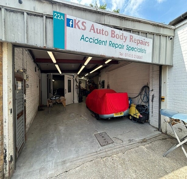 A single storey auto body repair workshop with a small concrete yard area to the front and side. The unit benefits from a wide roller shutter loading door, 3-Phase power, rear office, kitchen and toilet. There is an integrated Haltec spray booth with ventilation, designed for professional vehicle paintwork.