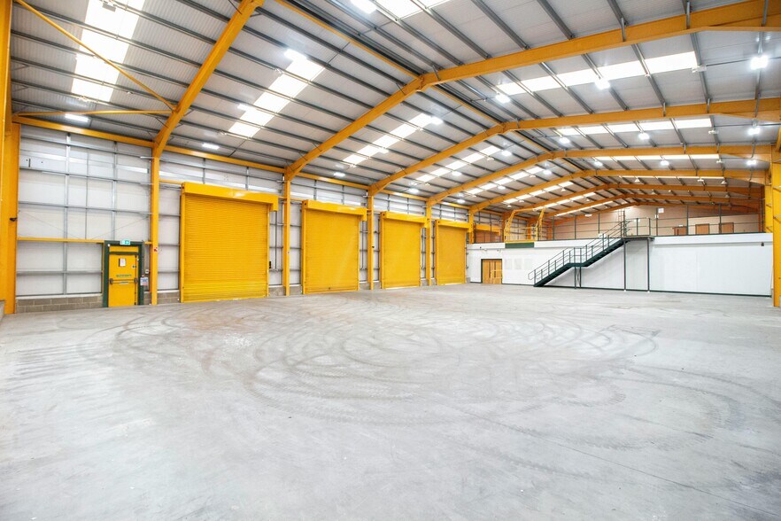 Newly constructed in 2021, this modern warehouse / distribution unit benefits from a steel portal frame construction with profile metal-clad elevations beneath a pitched roof. The ground floor provides a reception/showroom area alongside clear, open-plan warehouse accommodation, with access via five full-height electric shutter doors which are serviced by an excellent, securely gated yard, benefiting from two independent points of access. Additional mezzanine storage is provided at first-floor level. The building further benefits from three-phase power, solar panels, and an impressive maximum internal height of approximately 8.41 metres. The property is to be sold with full vacant possession.