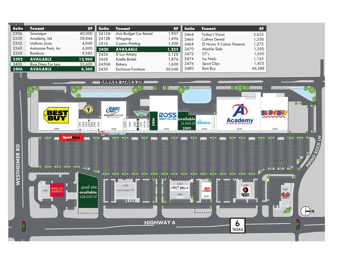 The Village At West Oaks 2300-2480 S Hwy 6 1 223–20 543 pi² d'espace disponible • Commerce de détail • Houston, TX 77077