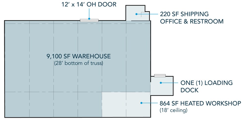 Available Space 10,184 SF - 9,100 SF Warehouse - 1,084 SF Office Term Through 04/30/2027 PROPERTY SPECS Clear Height 18’ - 28’ Column Spacing 20’ x 20’ in low bay 60’ x 120’ in high bay Loading 1 (12’ x 14’) drive-in door 1 (10’ x 10’) dock door Electric 200-amp single-phase Lighting Mix of LED and 400-watt metal halide Parking: 5 parking spaces