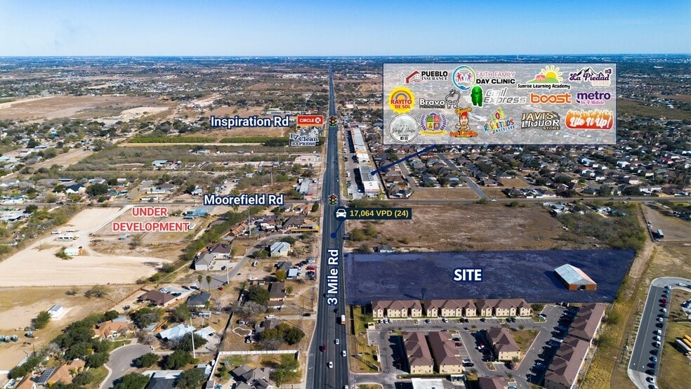 Positioned on W Mile 3 Rd in Mission, this 4.53-acre commercial site offers strong visibility (reported 17,064 vehicles/day) and convenient access for a range of retail, office, or mixed-use concepts. The property includes an unfinished ±5,084 SF pavilion/flex improvement that can be completed for a restaurant, retail, or event-driven use. Nearby Apartments and the IDEA Palmview campus add steady daily demand drivers.