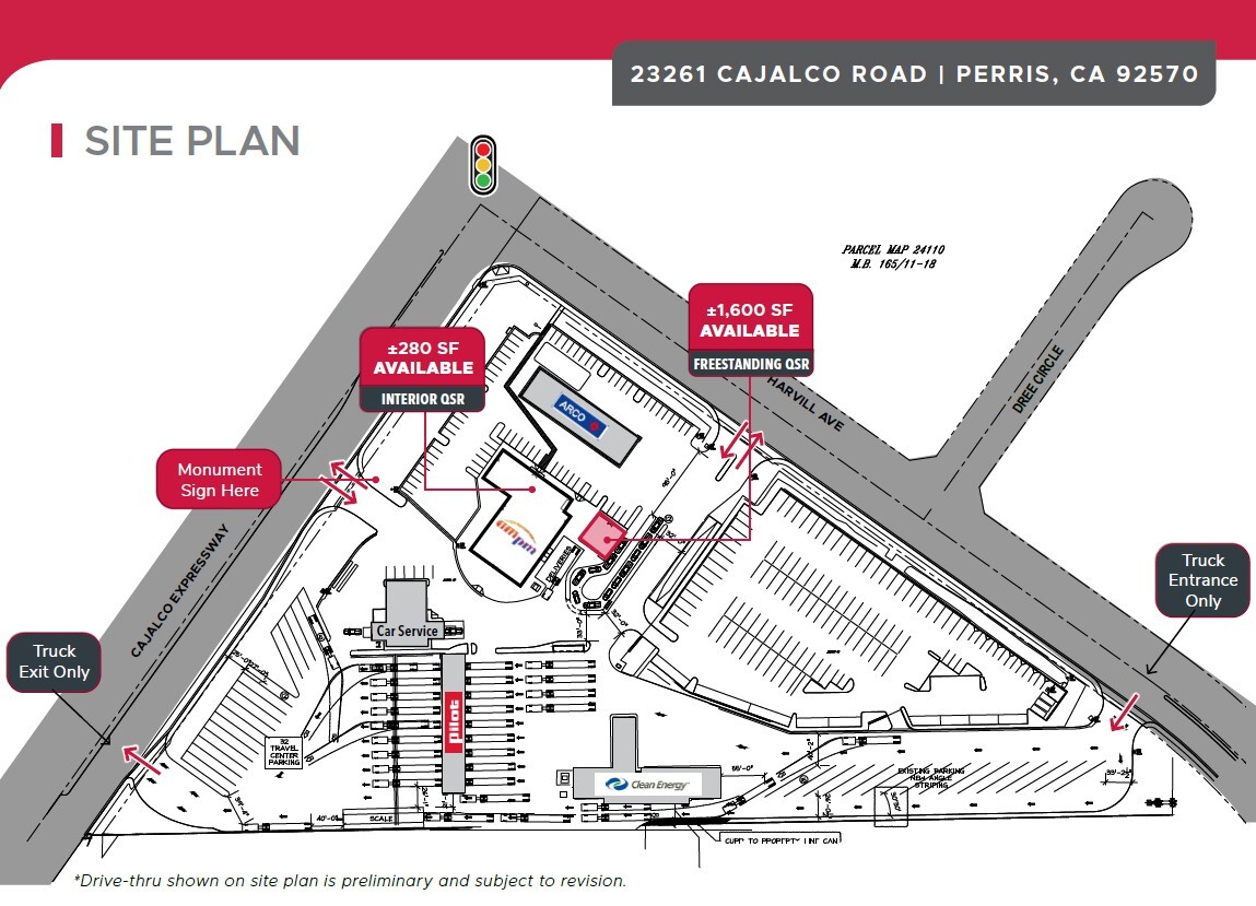 • ±280 SF Interior QSR • Signalized intersection with ±23,900 on Cajalco Rd & Harvill Ave • Strong daytime population of 106,569 within a 5-mile radius • Estimated 932 daily visitors based on projected fuel volumes • Ample truck parking (35 spaces) and showers - key amenities that draw consistent customer traffic • 11.5-acre site with ample parking • Exclusive patio space available • Exclusive patio space available