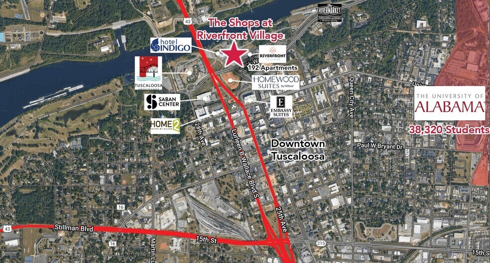 Aménagement à usage mixte de classe A, The Shops at Riverfront Village offre 21 319 pc d'espace de vente au détail et 192 appartements, ainsi que les voisins Hôtel Indigo, un hôtel de classe A à 91 clés près du campus Le site est adjacent à l'amphithéâtre Tuscaloosa ainsi qu'au Saban Center, un centre communautaire de 100 000 SF centré sur la vapeur qui comprendra le district de la rivière Parc