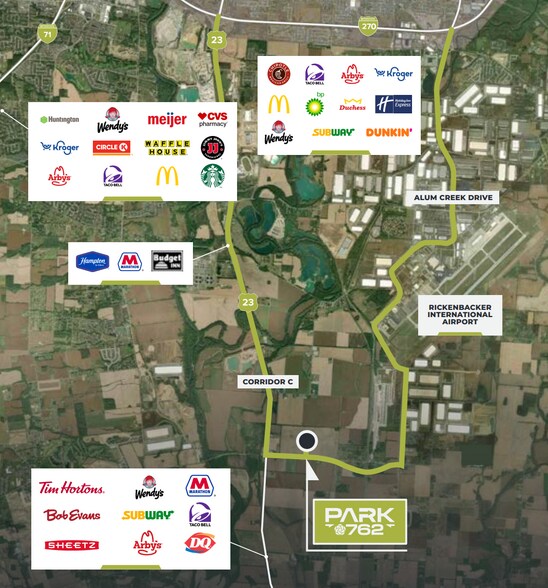 Park 762 is a 286-acre, master-planned industrial park located on SR 762 with immediate access to Rickenbacker Global Logistics Park, a premier hub designed to streamline large-scale distribution and accelerate the movement of goods in Columbus’ largest industrial sub-market. The park is only a half mile from the intersection of SR 762 and US Route 23; ODOT plans to convert this intersection to a full interchange by 2028.