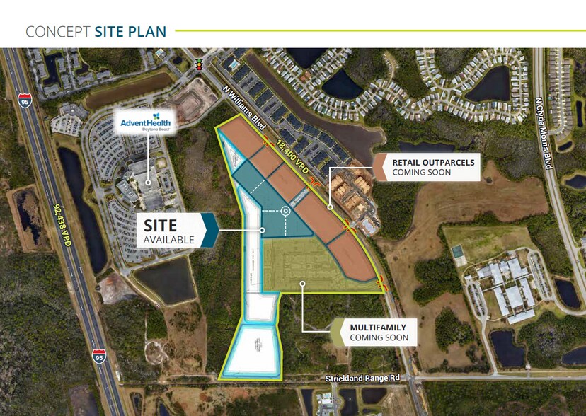 Evergreen on Williamson is an ±8 net acre mixed-use development opportunity located at 2340 & 2360 N Williamson Blvd in Daytona Beach, Florida. The site is zoned Mixed Use – Vacant Commercial, allowing for dense multifamily, retail, and complementary commercial uses, with off-site retention already in place. Positioned along N Williamson Blvd (±18,400 VPD) and just east of Interstate 95 (±92,438 VPD), the property offers exceptional regional access and visibility. The site is willing to subdivide and is well-suited for a phased development approach including retail outparcels and multifamily components. The property is located adjacent to AdventHealth Daytona Beach and is surrounded by established residential communities, national retailers, and major employers, making it ideal for developers seeking exposure in one of Daytona Beach’s fastest-growing corridors.