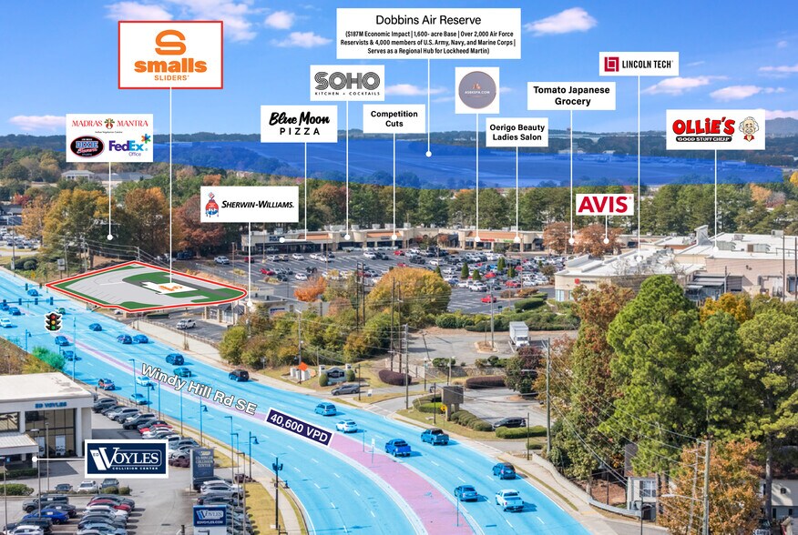 The site is less than one mile from Dobbins Air Reserve Base, a 1,600-acre installation with more than 4,000 active and reserve personnel and an annual economic impact of $187 million. It is also minutes from The Battery Atlanta and Truist Park—home of the Atlanta Braves—which together draw over 10 million visitors annually. The immediate area is supported by robust retail, hospitality, automotive, and residential development, generating strong daytime population and consistent consumer traffic.