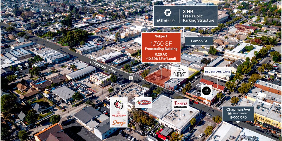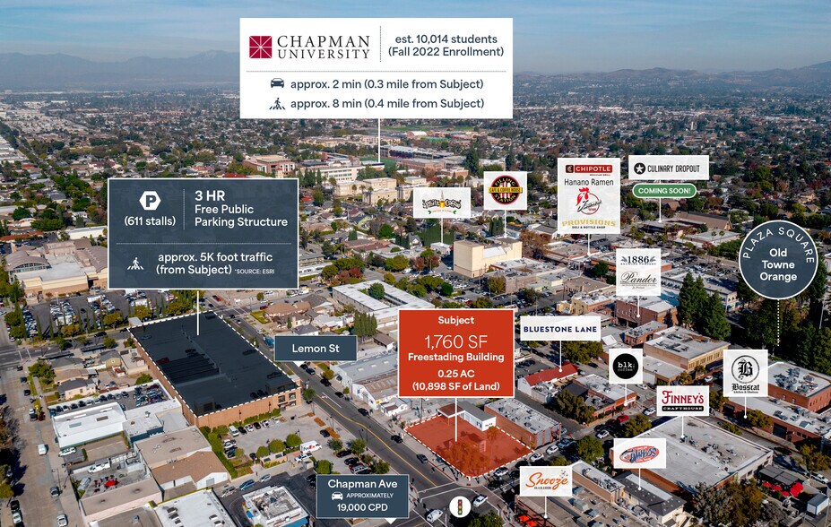 Rare terrain de 0,25 acre à louer avec 1 760 pi2 de charmant immeuble historique situé dans la vieille ville d'Orange dans le sillon d'une dynamique économique importante. La propriété est située à l'intersection signalée de Chapman et Lemon, entre la plus grande structure de stationnement public de la vieille ville et la Plaza Square.