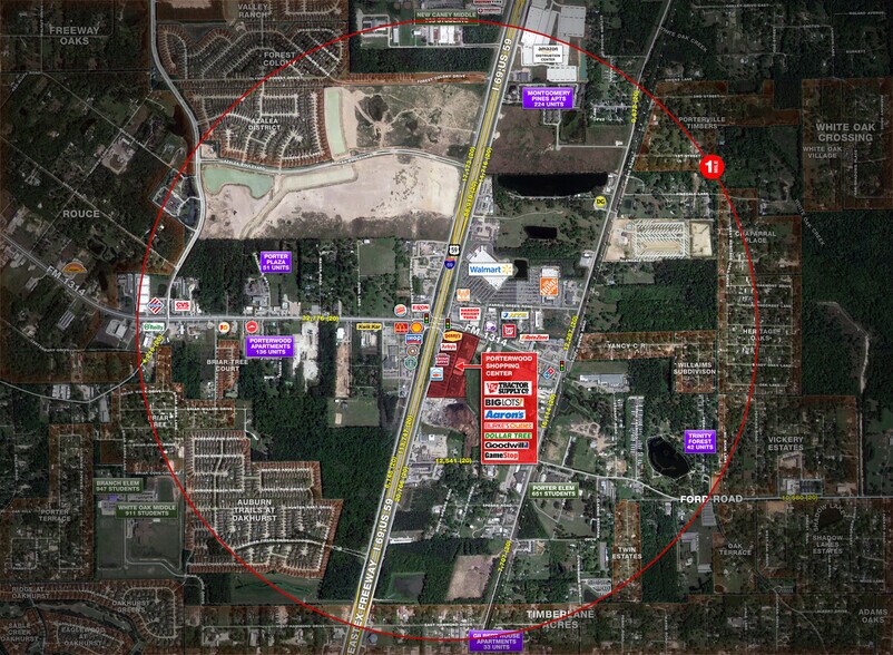 Le centre commercial Porterwood est situé à l'intersection principale de l'autoroute 59 et de la FM 1314 à Porter, au Texas. Le site a une entrée et une sortie par la route frontale de la route 59 et le FM 1314, avec visibilité et signalisation vers toutes les grandes artères de la région. Porter est une zone à forte croissance entourée de plus de 44 000 maisons dans un rayon de 5 milles.