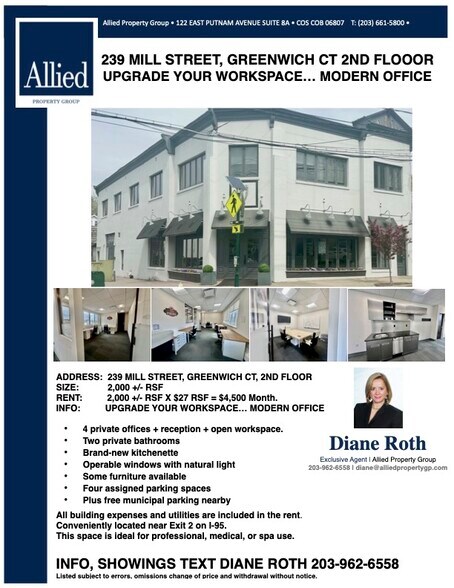 239 MILL STREET, GREENWICH CT, 2E ÉTAGE 2 000 +/- pi² X 30 $/pi² = 5 000 $/MOIS 4 GRANDES PIÈCES + ESPACE RÉCEPTION + GRAND ESPACE OUVERT MEUBLES POSSIBLES 2 SALLES DE BAIN NOUVELLE CUISINETTE 4 PLACES DE STATIONNEMENT ATTRIBUÉES + STATIONNEMENT MUNICIPAL GRATUIT SORTIE 2 SUR L’I-95 FENÊTRES OUVRANTES DÉPENSES DE L’IMMEUBLE INCLUSES DANS LE LOYER SERVICES PUBLICS ÉGALEMENT INCLUS DANS LE LOYER POUR INFO ET VISITES, TEXTEZ DIANE ROTH AU 203-962-6558 Annonce sujette à erreurs, omissions, modification de prix et retrait sans préavis.